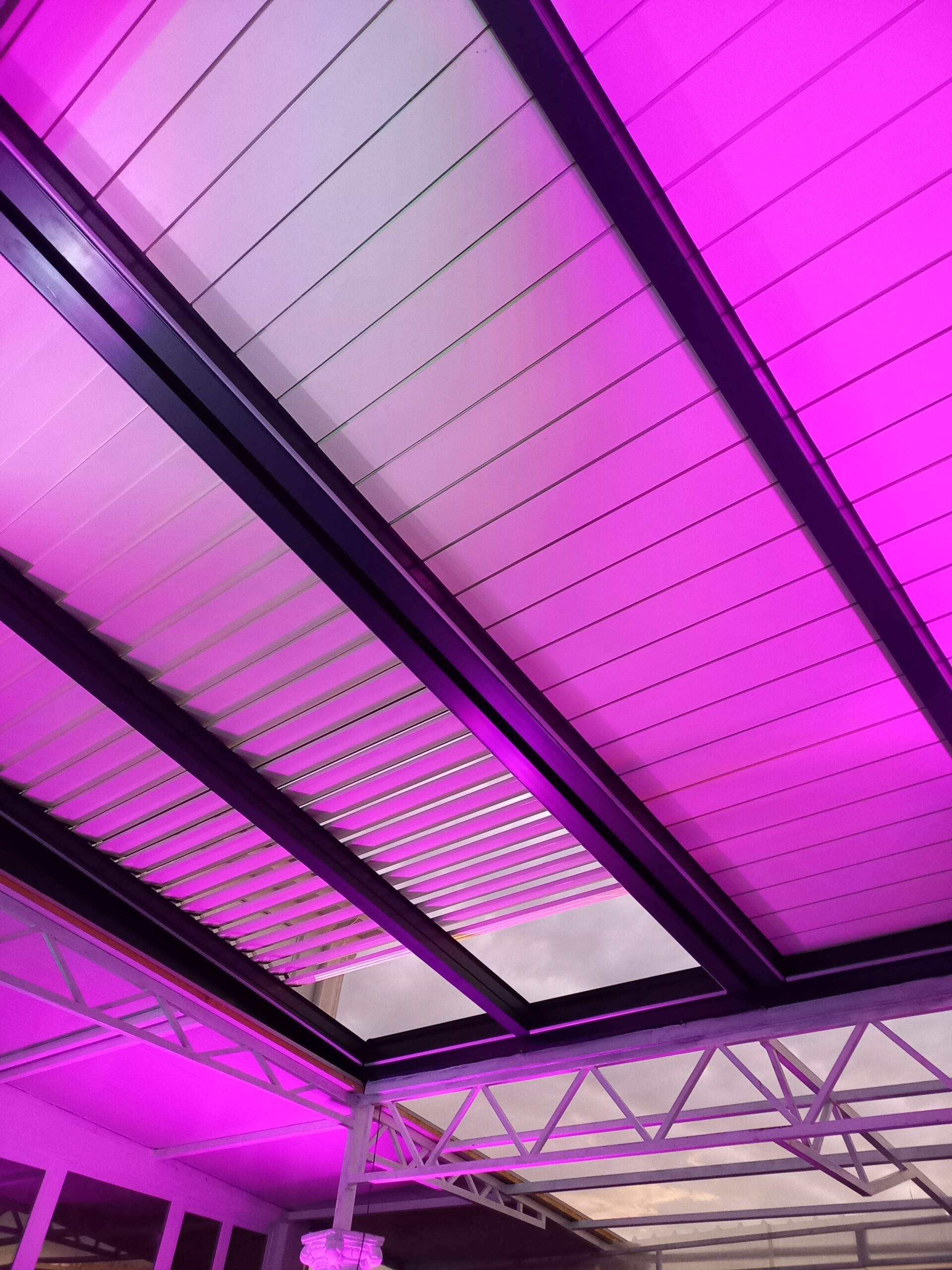 Precipitation on aluminum sliding roof panels is transferred to the main flow profile through the flow on the panels and evacuated from the main flow profile to the outside area. The linear LED system used in the system is a Samsung brand. The LED application can be made in any color and the dimmer can be used in lighting.